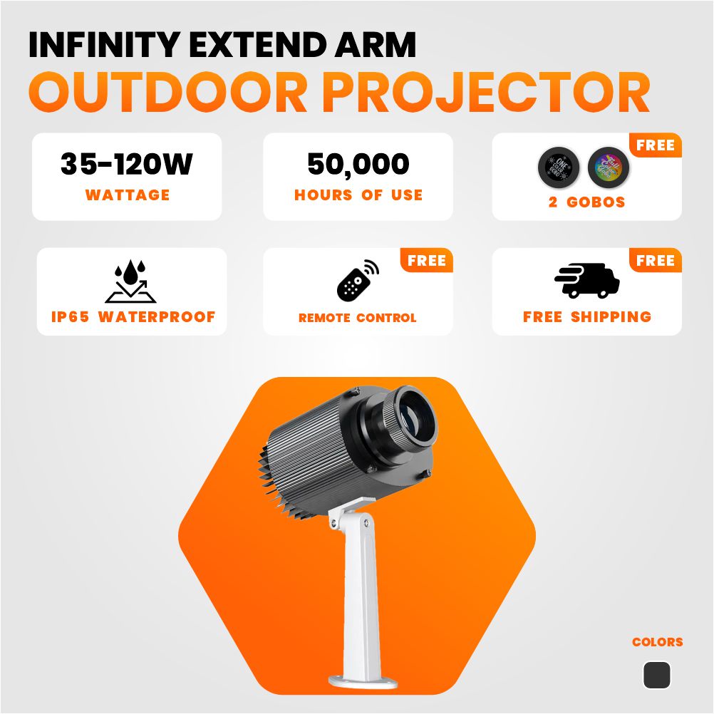 The Gobo’Logo Extend-Arm Outdoor Projector is a versatile, high-performance solution for distributors looking to provide clients with an innovative and memorable way to display logos, messages, or signage outdoors. Designed for precision and reliability, this model is part of our full line of logo projectors and digital signage solutions.
