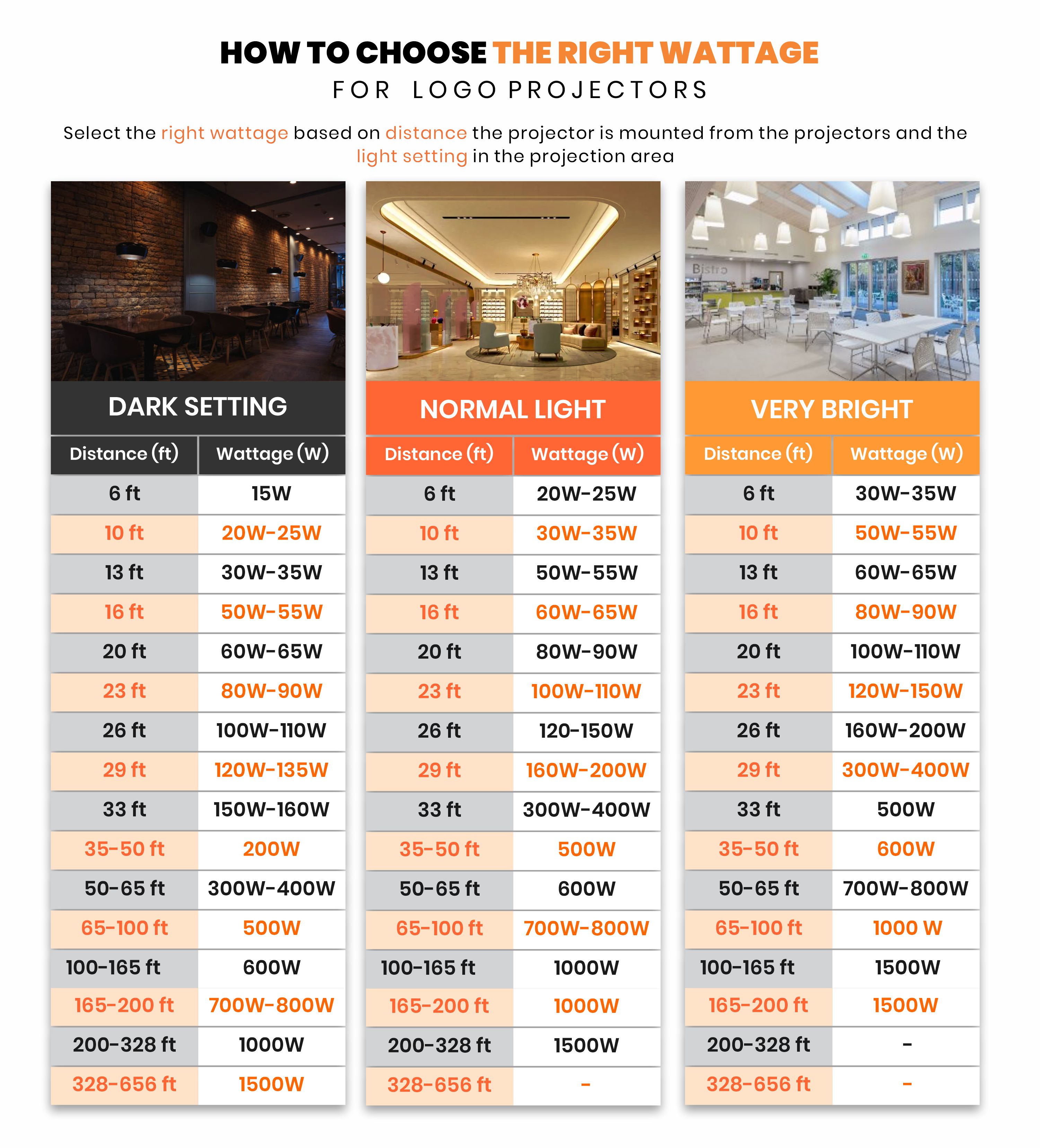Mounting Distance – Shorter distances work with lower wattages.