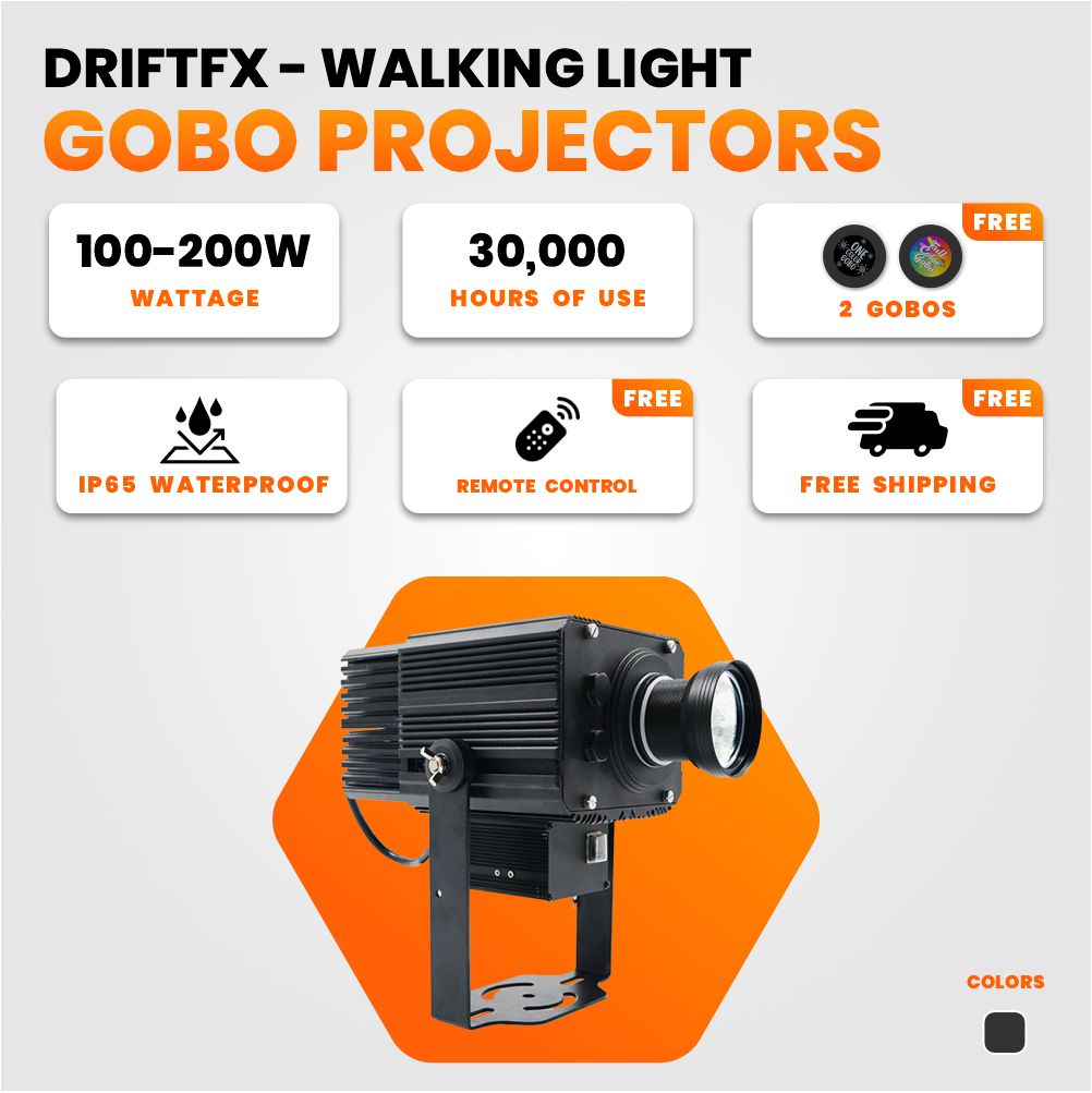 The Falling Effect Outdoor Waterproof Gobo Projector – 100W–200W is designed to turn logos, designs, or patterns into moving displays. By adding motion to the projection, it creates a falling effect, making graphics appear like snow, rain, petals, or other cascading visuals.