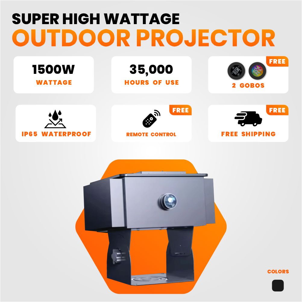 The Super High Wattage Outdoor Waterproof Gobo Projector – 1500W is designed for the biggest stages, tallest buildings, and most demanding applications. With unrivaled brightness and projection distance, it ensures your logo, message, or design is impossible to miss.