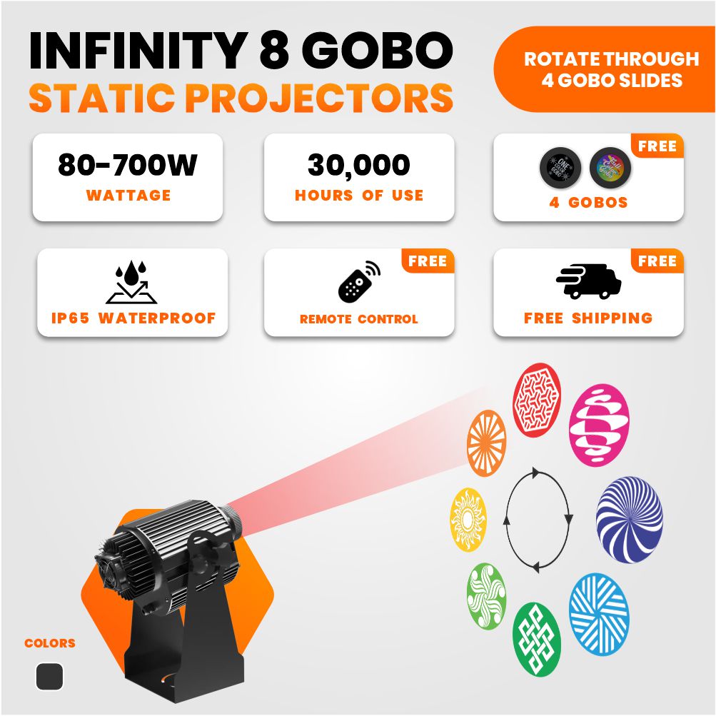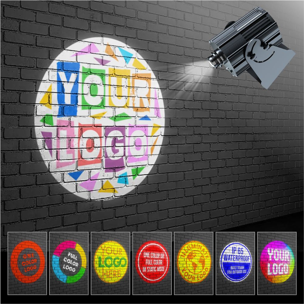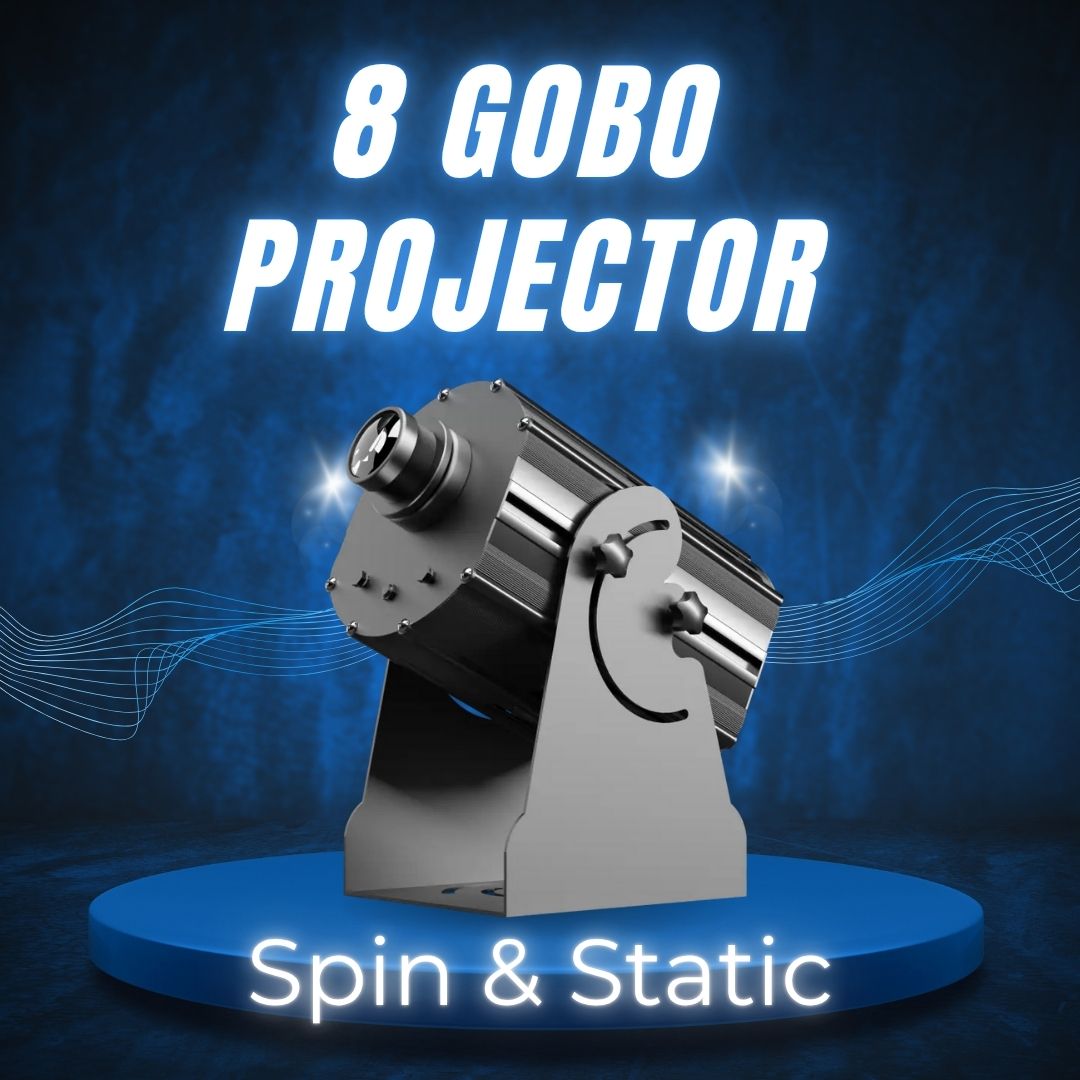 You get 8 free custom full-color gobos with each unit. That means you can prepare a complete rotation—brand logos, sponsor art, holiday designs, or safety/wayfinding icons—without extra purchases.