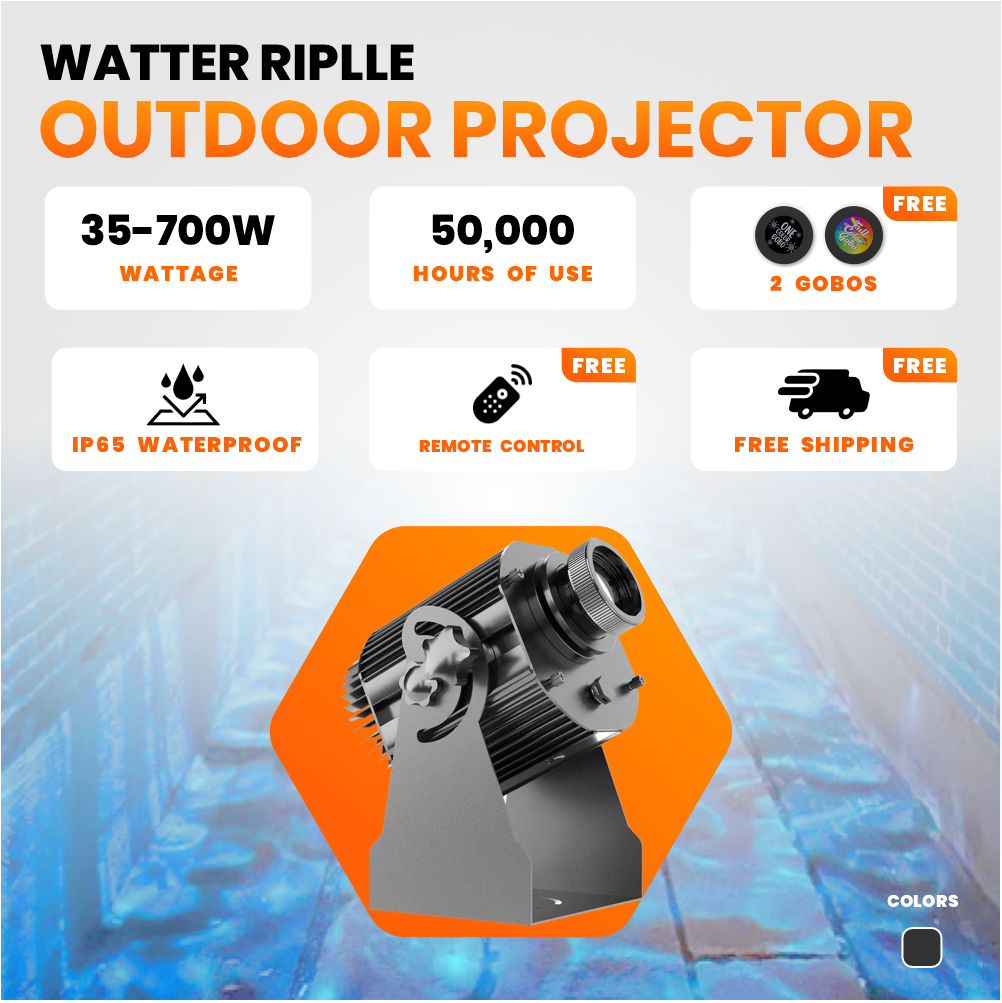 The Water Ripple Outdoor Waterproof LED Projector – 35W–700W is a decorative projector that brings motion, color, and ambience to outdoor spaces. Designed for hotels, restaurants, venues, and retail, it projects flowing water ripple effects in a variety of vivid colors.