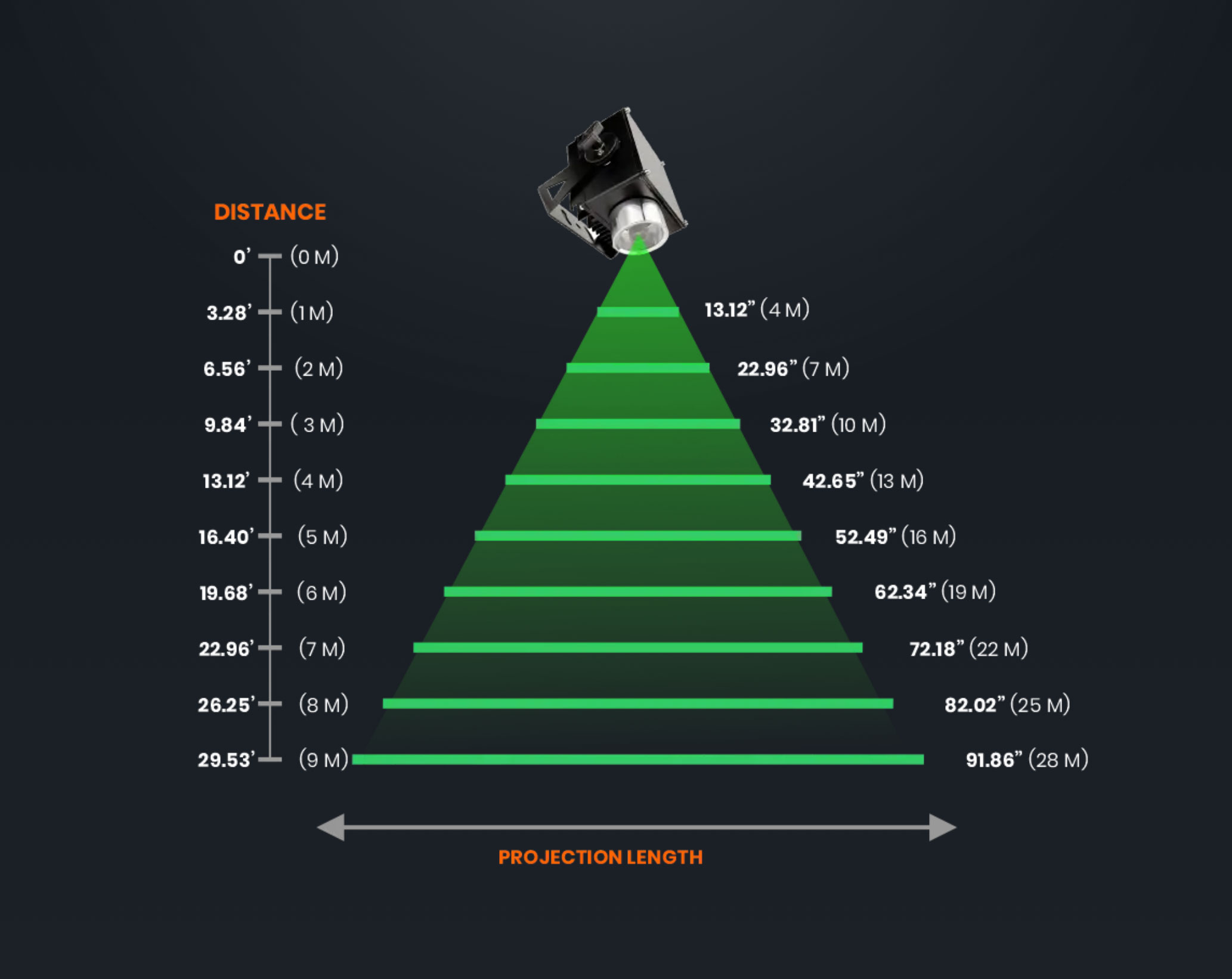 This projector casts lines up to 90 feet long, depending on how far the unit is mounted from the projection surface. The farther the projector, the longer the line it produces. Visibility is also affected by the surface color/texture and the ambient light in the space.