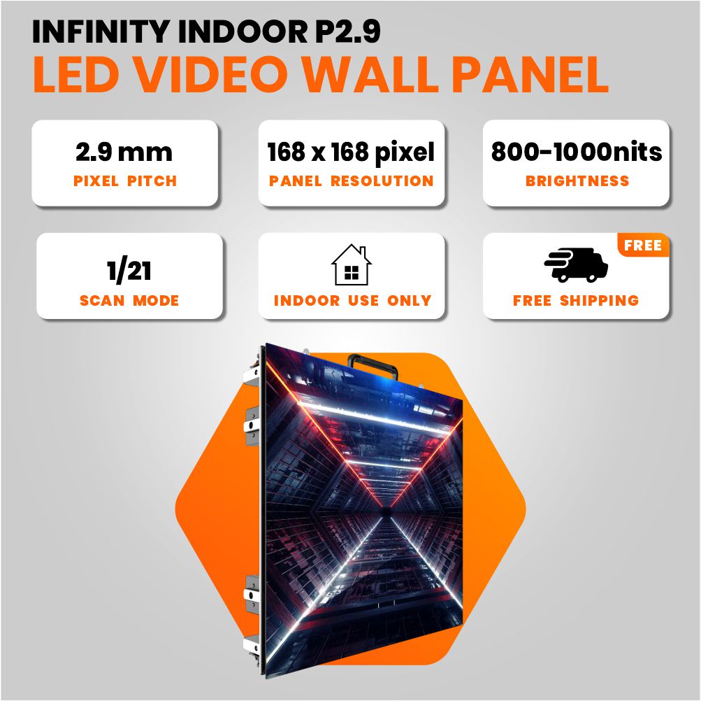 The Indoor P2.9mm LED Video Wall Panel is one of the most widely used LED video solutions due to its balance of resolution, price, and performance. With its 2.9mm pixel pitch, it is suited for viewing distances of 10–13 ft or more, making it ideal for retail, events, and corporate installations. Technical Specifications Pixel pitch: 2.9mm Panel size: 500×500mm (19.7"×19.7") Brightness: 800–1000 nits Material: Lightweight die-cast aluminum (~7kg) Refresh rate: 3840–7680Hz Grayscale: 14–16 bit Lifespan: 50,000 hours Daily operation: up to 16 hours/day Modular & Seamles Panels connect seamlessly for scalable video wall systems, delivering smooth visuals without visible seams. P2.9 offers excellent clarity at a lower cost compared to finer-pitch models, making it the most common choice for mid-range applications. Control Options Video walls require a controller along with either: PC + controller for live switching. Android media player + controller for remote content scheduling. Support & Delivery Panels include a 2-year warranty and lifetime technical support. Stocked in the U.S., orders ship in 3–5 business days, with expedited service available. Applications Trade shows and exhibitions Studios and production spaces Corporate displays and offices Retail installations Hospitality and event venues The Indoor P2.9mm LED Panel is a professional-grade solution that combines strong performance, affordability, and fast delivery. Other pixel options (P1.9mm, P2.6mm, P3.9mm indoor and outdoor) are also available.